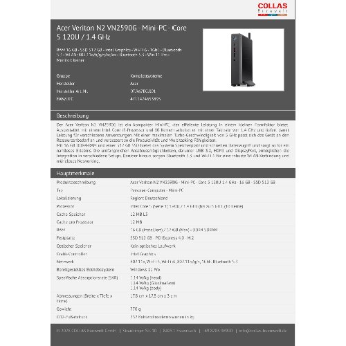Jetzt anmeldenProduktinformationen "Acer Veriton N2 VN2590G - Mini-PC - Core 5 120U / 1.4 GHz"