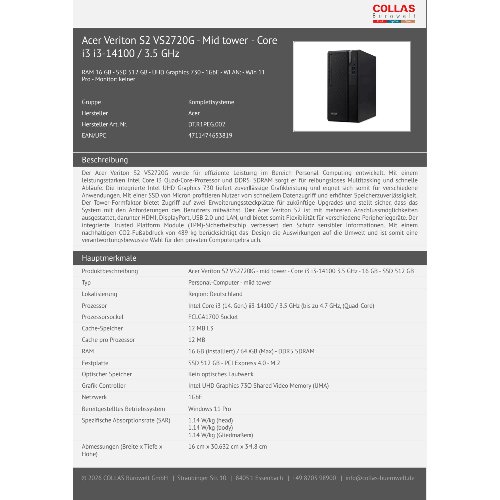 Jetzt anmeldenProduktinformationen "Acer Veriton S2 VS2720G - Mid tower - Core i3 i3-14100 / 3.5 GHz"