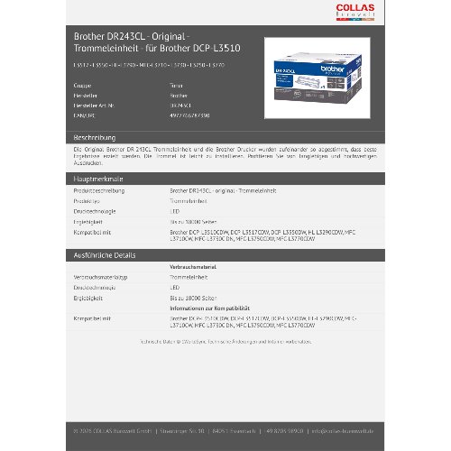 - Die Original Brother DR-243CL Trommeleinheit und die Brother Drucker wurden aufeinander so abgestimmt, dass beste Ergebnisse erzielt werden. Die Trommel ist leicht zu installieren. Profitieren Sie von langlebigen und hochwertigen Ausdrucken.
