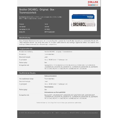 - Diese Original-Trommeleinheit wurde von unseren Experten speziell für Ihren Brother-Laserdrucker entwickelt. Mit der DR-248CL-Trommel können Sie sicher sein, dass Ihr Drucker auch weiterhin hochwertige Ergebnisse liefert: Die Schärfe Ihrer wichtigen Dokumente wird Ihren Erwartungen entsprechen.