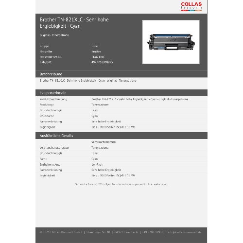 Jetzt anmeldenProduktinformationen "Brother TN-821XLC - Sehr hohe Ergiebigkeit - Cyan"