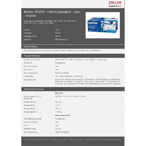 Jetzt anmeldenProduktinformationen "Brother TN135C - Hohe Ergiebigkeit - Cyan - original"