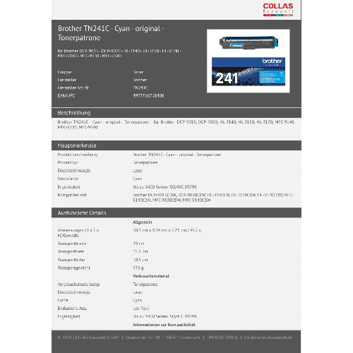 Jetzt anmeldenProduktinformationen "Brother TN241C - Cyan - original - Tonerpatrone"
