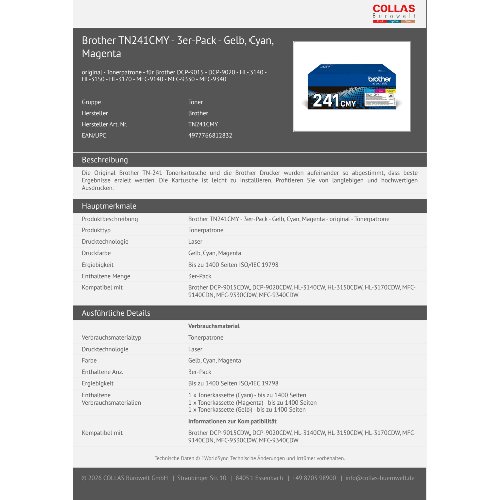 Jetzt anmeldenProduktinformationen "Brother TN241CMY - 3er-Pack - Gelb, Cyan, Magenta"
