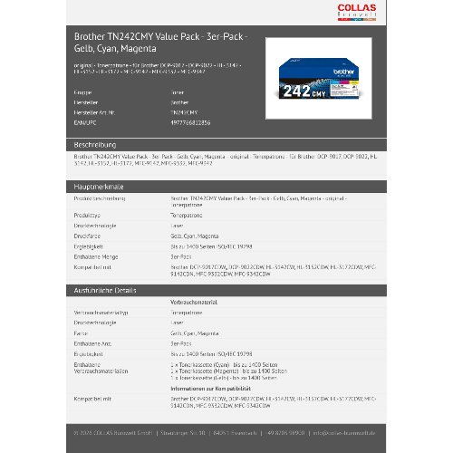Jetzt anmeldenProduktinformationen "Brother TN242CMY Value Pack - 3er-Pack - Gelb, Cyan, Magenta"