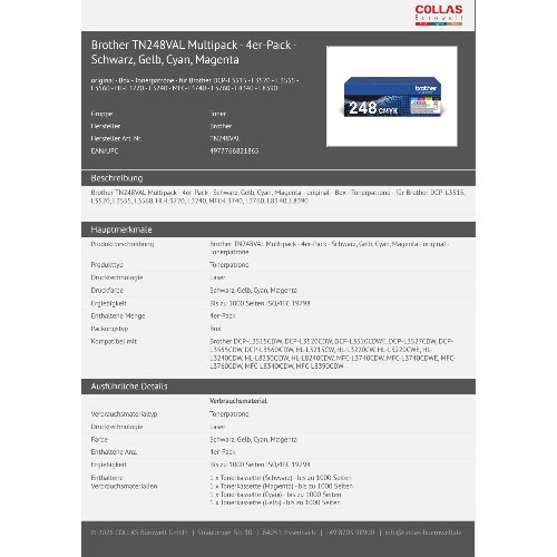 Jetzt anmeldenProduktinformationen "Brother TN248VAL Multipack - 4er-Pack - Schwarz, Gelb, Cyan, Magenta"