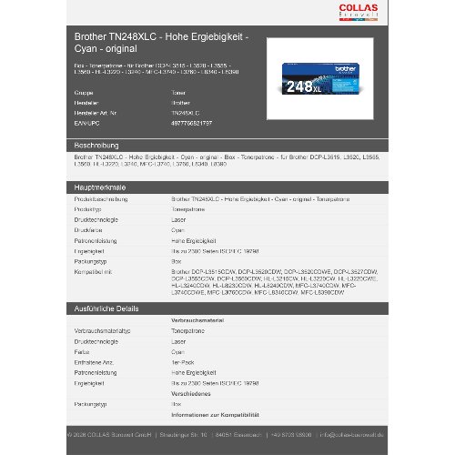 Jetzt anmeldenProduktinformationen "Brother TN248XLC - Hohe Ergiebigkeit - Cyan - original"