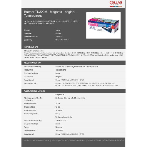 - TN-320M TonerkassetteDiese Tonerkassette ist kompatibel mit folgenden Geräten: DCP-9055CDN / DCP-9270CDN / HL-4140CN / HL-4150CDN / HL-4570CDW / HL-4570CDWT / MFC-9460CDN / MFC-9465CDN / MFC-9970CDW und hat eine Reichweite von 1.500 Seiten, nach ISO/IEC 19798.