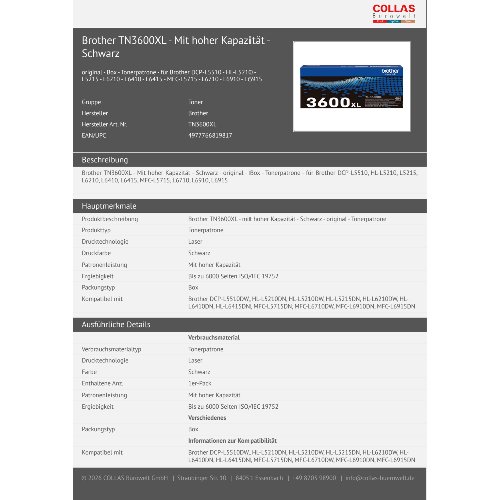 Jetzt anmeldenProduktinformationen "Brother TN3600XL - Mit hoher Kapazität - Schwarz"