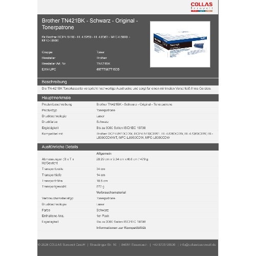 - Die TN-421BK Tonerkassette verspricht hochwertige Ausdrucke und sorgt für einen minimalen Verschleiß Ihres Gerätes.