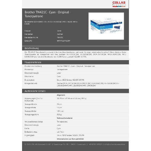 Jetzt anmeldenProduktinformationen "Brother TN421C - Cyan - Original - Tonerpatrone"