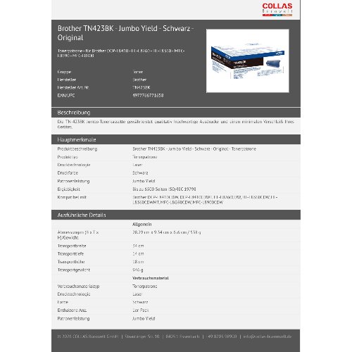 - Die TN-423BK Jumbo-Tonerkassette gewährleistet qualitativ hochwertige Ausdrucke und einen minimalen Verschleiß Ihres Gerätes.