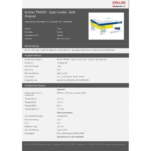 - Die TN-426Y Super-Jumbo-Tonerkassette genügt höchsten Qualitätsansprüchen und bietet eine hohe Reichweite.