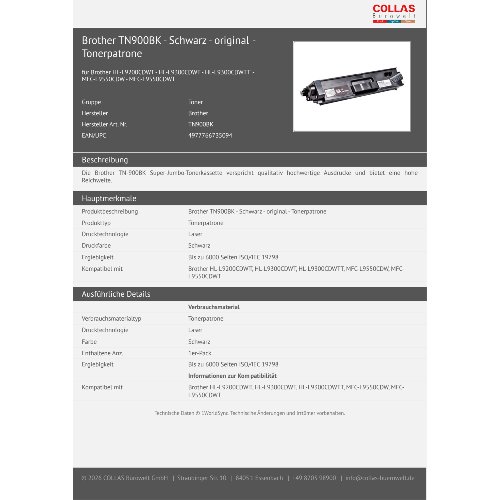 - Die Brother TN-900BK Super-Jumbo-Tonerkassette verspricht qualitativ hochwertige Ausdrucke und bietet eine hohe Reichweite.