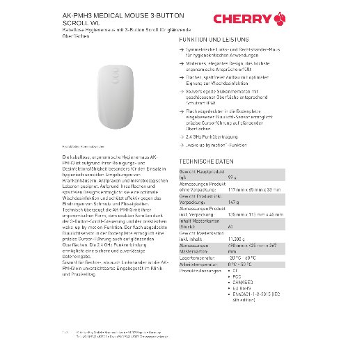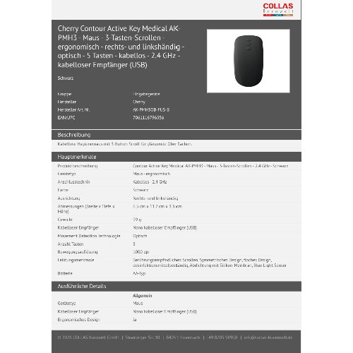 Jetzt anmeldenProduktinformationen "Cherry Contour Active Key Medical AK-PMH3 - Maus - 3-Tasten-Scrollen - ergonomisch - rechts- und linkshändig - optisch - 5 Tasten - kabellos - 2.4 GHz - kabelloser Empfänger (USB)"