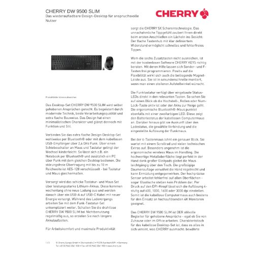 - Das Desktop-Set CHERRY DW 9500 SLIM wird selbst gehobenen Ansprüchen gerecht. Es begeistert durch modernste Technik, beste Verarbeitungsqualität und extra flache Bauweise. Das Design hat einen minimalistischen Charakter und glänzt dennoch mit Funktion und Stil.