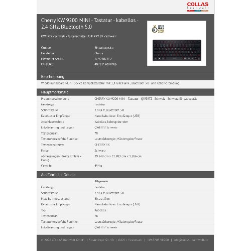Cherry KW 9200 MINI - Tastatur - kabellos - 2.4 GHz, Bluetooth 5.0
