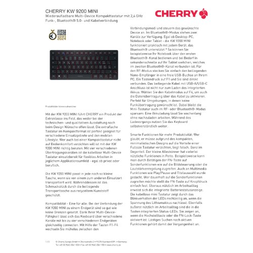 Jetzt anmeldenProduktinformationen "Cherry KW 9200 MINI - Tastatur - kabellos - 2.4 GHz, Bluetooth 5.0"