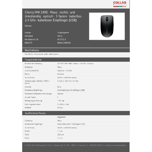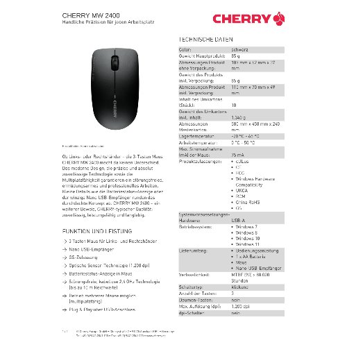 Jetzt anmeldenProduktinformationen "Cherry MW 2400 - Maus - rechts- und linkshändig - optisch - 3 Tasten - kabellos - 2.4 GHz - kabelloser Empfänger (USB)"