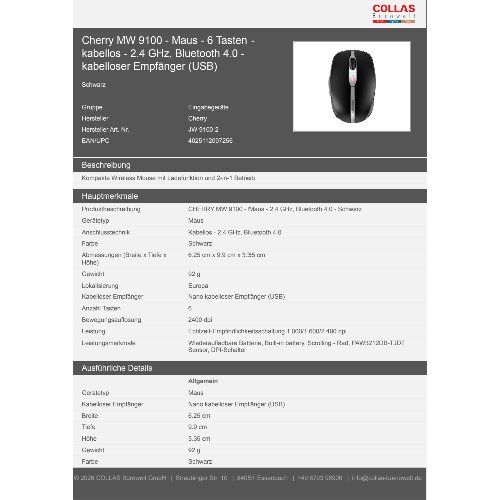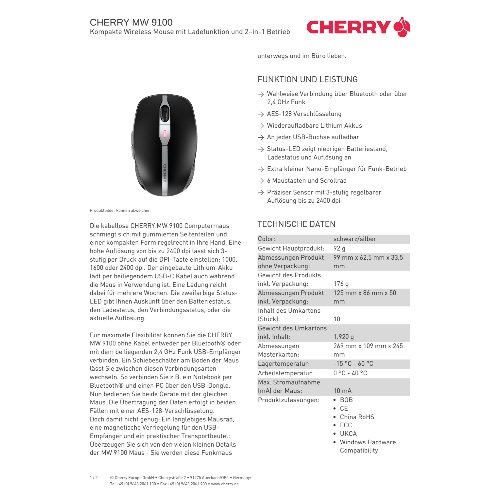 Jetzt anmeldenProduktinformationen "Cherry MW 9100 - Maus - 6 Tasten - kabellos - 2.4 GHz, Bluetooth 4.0 - kabelloser Empfänger (USB)"