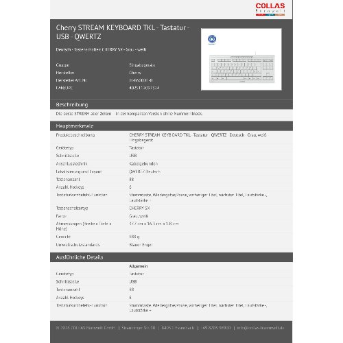 Jetzt anmeldenProduktinformationen "Cherry STREAM KEYBOARD TKL - Tastatur - USB - QWERTZ"