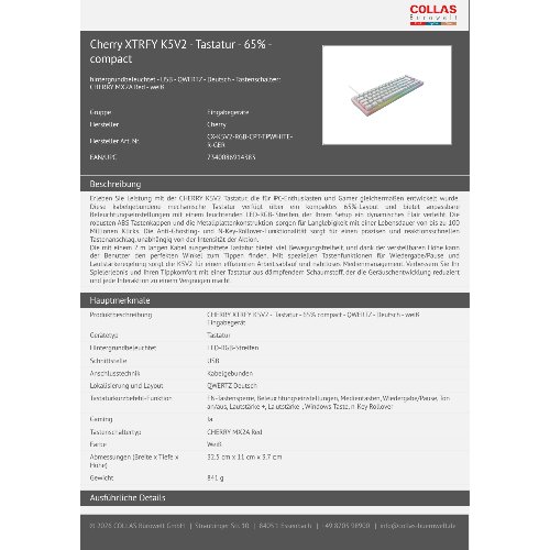 - Erleben Sie Leistung mit der CHERRY K5V2 Tastatur, die für PC-Enthusiasten und Gamer gleichermaßen entwickelt wurde. Diese kabelgebundene mechanische Tastatur verfügt über ein kompaktes 65%-Layout und bietet anpassbare Beleuchtungseinstellungen mit einem leuchtenden LED-RGB-Streifen, der Ihrem Setup ein dynamisches Flair verleiht. Die robusten ABS-Tastenkappen und die Metallplattenkonstruktion sorgen für Langlebigkeit mit einer Lebensdauer von bis zu 100 Millionen Klicks. Die Anti-Ghosting- und N-Key-Rollover-Funktionalität sorgt für einen präzisen und reaktionsschnellen Tastenanschlag, unabhängig von der Intensität der Aktion.Die mit einem 2 m langen Kabel ausgestattete Tastatur bietet viel Bewegungsfreiheit, und dank der verstellbaren Höhe kann der Benutzer den perfekten Winkel zum Tippen finden. Mit speziellen Tastenfunktionen für Wiedergabe/Pause und Lautstärkeregelung sorgt die K5V2 für einen effizienten Arbeitsablauf und nahtloses Medienmanagement. Verbessern Sie Ihr Spielerlebnis und Ihren Tippkomfort mit einer Tastatur aus dämpfendem Schaumstoff, der die Geräuschentwicklung reduziert und jede Interaktion zu einem Vergnügen macht.