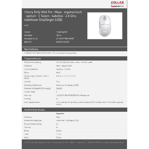 Jetzt anmeldenProduktinformationen "Cherry Xtrfy M64 Pro - Maus - ergonomisch - optisch - 5 Tasten - kabellos - 2.4 GHz - kabelloser Empfänger (USB)"