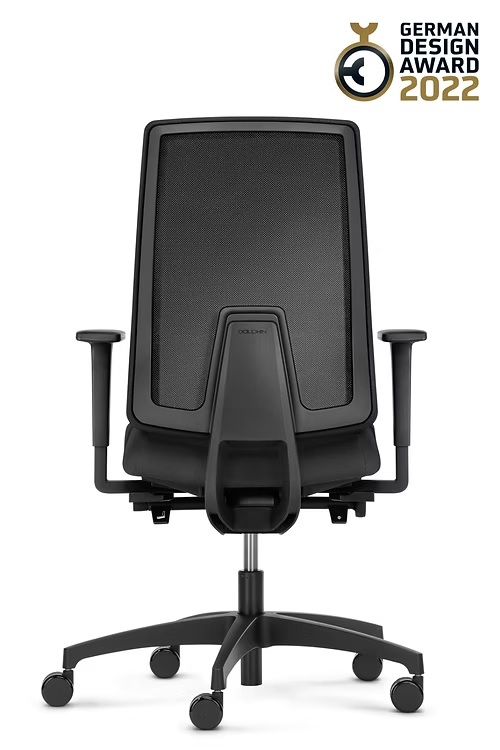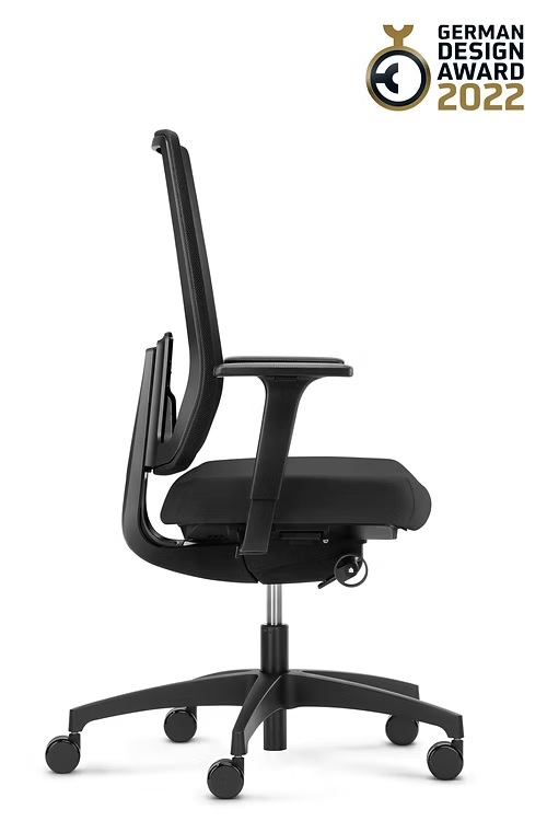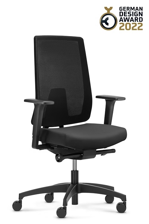 hohe, höhenverstellbare Netz-Rückenlehne (61 - 68 cm), Tale (Web B), schwarz; Sitzbezug Polo schwarz; Syncro-Evolution®-Technik, 4fach arretierbar; seitliche Verstellung des Rückenlehnengegendrucks mittels Handrad; vorwählbare Sitzneigeverstellung (0°/-4°); Sitztiefenverstellung mittels Schiebesitz (8 cm); Kunststoff-Fußkreuz Typ H, schwarz, mit weichen, großen Rollen (Ø 60 mm); 2F-Armlehnen mit Auflagen PU soft
