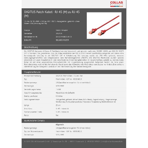 - Die DIGITUS® Kategorie 6 Klasse E Patchkabel werden hergestellt und getestet nach dem ISO/IEC 11801 und DIN EN 50173 CAT 6 Standard. Sie garantieren, dass die Kabelinstallation der ISO & EN Channel Spezifikation entspricht und bieten eine hervorragende Leistung in der DIGITUS® CAT 6 Verkabelung. Die Leistung wurde bis 250 MHz getestet, inklusive Leistungseigenschaften wie beispielsweise dem Nahnebensprechen (NEXT). Die DIGITUS® Patchkabel wurden speziell entwickelt um allen Ansprüchen in den verschiedenen Anwendungsbereichen in vollem Umfang gerecht zu werden. Jedes Kabel ist mit einer angespritzten Knickschutztülle mit Zugentlastung ausgestattet. Außerdem besitzt die Tülle einen Rasthebelschutz, welcher das Verhaken der Kabel sowie das Abbrechen des Rasthebels vom Stecker verhindert. Eine einfache Identifizierung der Kategorie 6 wird durch die rote Einfärbung der Stecker ermöglicht.