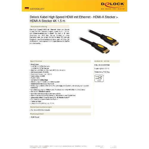 - Das High Speed HDMI mit Ethernet Kabel von Delock vereint schnelle Datenübertragung sowie Audio- / Video- und Ethernetverbindung in einem. Es dient z. B. dem Anschluss von DVD oder Blu-ray Geräten an einen Fernseher oder von einem Monitor an einen PC oder ein Notebook. Das Kabel unterstützt dabei auch 4K Ultra HD Auflösungen, vorausgesetzt alle angeschlossenen Geräte sind kompatibel.