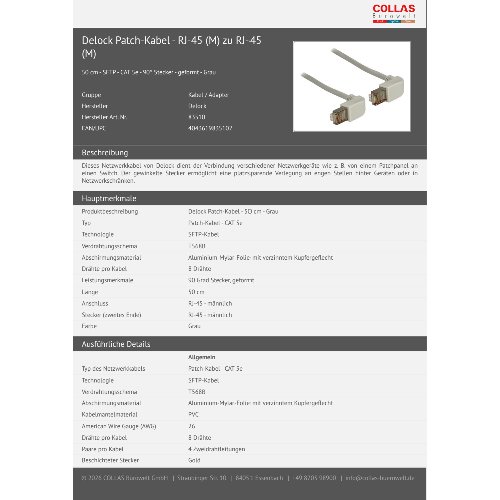 - Dieses Netzwerkkabel von Delock dient der Verbindung verschiedener Netzwerkgeräte wie z. B. von einem Patchpanel an einen Switch. Der gewinkelte Stecker ermöglicht eine platzsparende Verlegung an engen Stellen hinter Geräten oder in Netzwerkschränken.