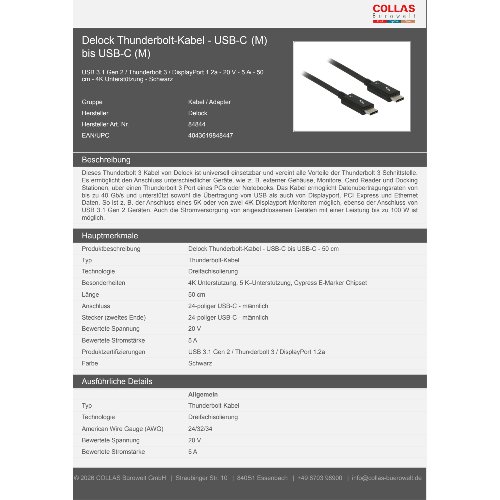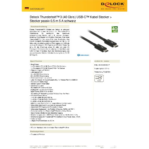 - Dieses Thunderbolt 3 Kabel von Delock ist universell einsetzbar und vereint alle Vorteile der Thunderbolt 3 Schnittstelle. Es ermöglicht den Anschluss unterschiedlicher Geräte, wie z. B. externer Gehäuse, Monitore, Card Reader und Docking Stationen, über einen Thunderbolt 3 Port eines PCs oder Notebooks. Das Kabel ermöglicht Datenübertragungsraten von bis zu 40 Gb/s und unterstützt sowohl die Übertragung von USB als auch von Displayport, PCI Express und Ethernet Daten. So ist z. B. der Anschluss eines 5K oder von zwei 4K Displayport Monitoren möglich, ebenso der Anschluss von USB 3.1 Gen 2 Geräten. Auch die Stromversorgung von angeschlossenen Geräten mit einer Leistung bis zu 100 W ist möglich.