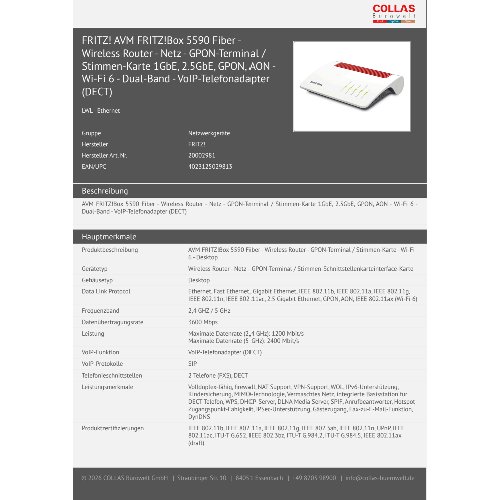 Jetzt anmeldenProduktinformationen "FRITZ! AVM FRITZ!Box 5590 Fiber - Wireless Router - Netz - GPON-Terminal / Stimmen-Karte 1GbE, 2.5GbE, GPON, AON - Wi-Fi 6 - Dual-Band - VoIP-Telefonadapter (DECT)"