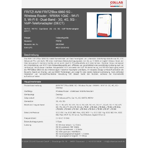 Jetzt anmeldenProduktinformationen "FRITZ! AVM FRITZ!Box 6860 5G - Wireless Router - WWAN 1GbE - Wi-Fi 5, Wi-Fi 6 - Dual-Band - 3G, 4G, 5G - VoIP-Telefonadapter (DECT)"