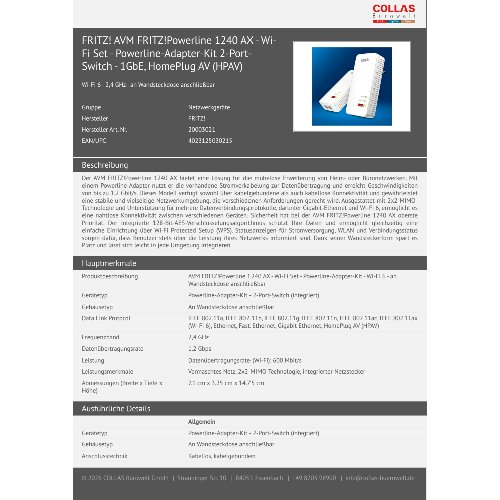 Jetzt anmeldenProduktinformationen "FRITZ! AVM FRITZ!Powerline 1240 AX - Wi-Fi Set - Powerline-Adapter-Kit 2-Port-Switch - 1GbE, HomePlug AV (HPAV)"