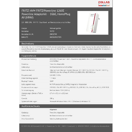 Jetzt anmeldenProduktinformationen "FRITZ! AVM FRITZ!Powerline 1260E - - Powerline Adapterkit - - 1GbE, HomePlug AV (HPAV)"