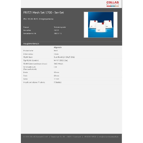 Jetzt anmeldenProduktinformationen "FRITZ! MESH1700-3 - Mesh Set 1700 3er-Set Wi-Fi 7 - WLAN - 3,6 Gbps"