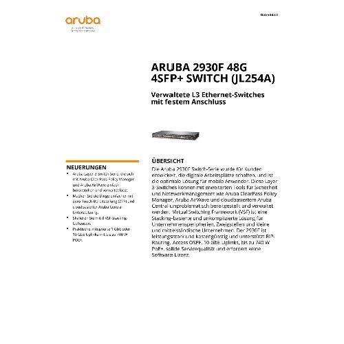 - Die Aruba 2930F Switch-Serie wurde für Kunden konzipiert, die digitale Arbeitsplätze schaffen, die mit einem integrierten kabelgebundenen und kabellosen Ansatz auf mobile Benutzer abgestimmt sind. Diese grundlegenden Layer-3-Access-Switches können mit erweiterten Tools für Sicherheit und Netzwerkverwaltung wie Aruba ClearPass Policy Manager und Aruba AirWave problemlos bereitgestellt und verwaltet werden und eignen sich optimal für Unternehmensperipherien, Zweigstellen und SMBs. Ein leistungsstarker Aruba ProVision ASIC bietet Leistung und Mehrwert, indem er die modernen SDN-Anwendungen mit zukunftsorientierter Programmierbarkeit unterstützt.