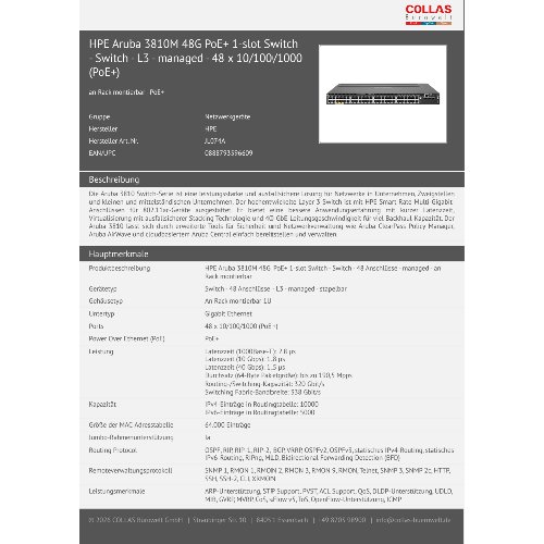 - Die Aruba 3810 Switch-Serie ist eine leistungsstarke und ausfallsichere Lösung für Netzwerke in Unternehmen, Zweigstellen und kleinen und mittelständischen Unternehmen. Der hochentwickelte Layer 3-Switch ist mit HPE Smart Rate-Multi-Gigabit-Anschlüssen für 802.11ac-Geräte ausgestattet. Er bietet eine bessere Anwendungserfahrung mit kurzer Latenzzeit, Virtualisierung mit ausfallsicherer Stacking-Technologie und 40-GbE-Leitungsgeschwindigkeit für viel Backhaul-Kapazität. Der Aruba 3810 lässt sich durch erweiterte Tools für Sicherheit und Netzwerkverwaltung wie Aruba ClearPass Policy Manager, Aruba AirWave und cloudbasiertem Aruba Central einfach bereitstellen und verwalten.