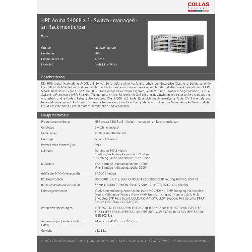 - Die HPE Aruba Networking 5400R zl2 Switch-Serie liefert eine Ausfallsicherheit der Enterprise-Class und bahnbrechende Flexibilität für Mobile First-Netzwerke. Der hochentwickelte modulare Layer-3-Switch liefert skalierbare Aggregation mit HPE Smart Rate-Multi-Gigabit-Ports für 802.11ac-Hochgeschwindigkeitsgeräte, verfügt über Dynamic Segmentation, Virtual Switching Framework (VSF) Stacking-Technologie, Hitless-Failover, 40 GbE Leitungsgeschwindigkeit, robuste Servicequalität u. -sicherheit und erfordert keine Softwarelizenz. Die 5400R zl2 Serie lässt sich durch erweiterte Tools für Sicherheit und Netzwerkmanagement Tools wie HPE Aruba Networking ClearPass Policy Manager, HPE Aruba Networking AirWave und das Cloud-basierte Aruba Central einfach bereitstellen und verwalten.