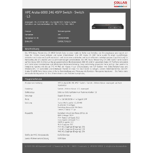 - Die HPE Aruba Networking CX 6000 Switch-Serie ist eine moderne Reihe von Switches der Einstiegsklasse und eignet sich ideal für Filialen sowie mittlere und kleine Unternehmen. Die HPE Aruba CX 6000 Serie wurde für einen zuverlässigen, einfachen und sicheren Zugriff entwickelt und bietet eine praktische und kosteneffiziente kabelgebundene Zugriffslösung für Netzwerke, die IoT-, mobile und Cloud-Anwendungen unterstützen. Die HPE Aruba Networking CX 6000 Switch Serie basiert auf der Aruba ASIC-Architektur. Das programmierbare Betriebssystem AOS-CX wird im gesamten Aruba CX Portfolio verwendet und bietet eine konsistentere und effizientere Bedienererfahrung. Diese vollständig verwaltete Serie verfügt über praktische integrierte Uplinks mit bis zu 740 W PoE der Klasse 4 zur Unterstützung von IoT Geräten wie Sicherheitskameras und Wireless-APs. Ein kompaktes und lüfterloses Modell ist ideal für den Einsatz in ruhigen, kleinen Arbeitsbereichen. Die HPE Aruba CX 6000 Serie bietet eine einfache Bereitstellung und Nutzung mit flexiblen Managementoptionen – Sie finden stets die ideale Konfiguration für Ihre Unternehmens- und Netzwerkumgebung.