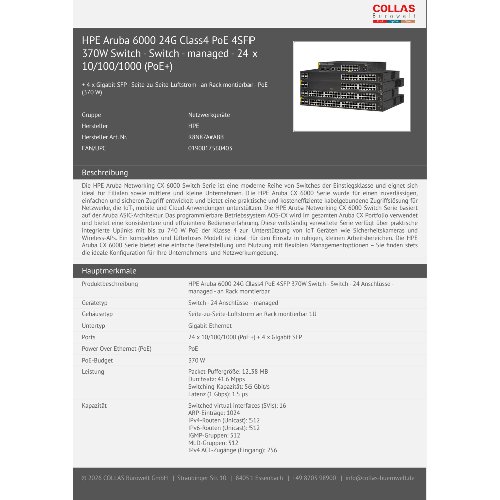 Jetzt anmeldenProduktinformationen "HPE Aruba 6000 24G Class4 PoE 4SFP 370W Switch - Switch - managed - 24 x 10/100/1000 (PoE+)"