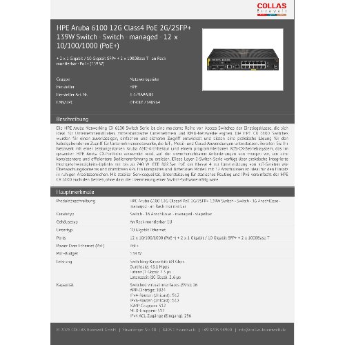 - Die HPE Aruba Networking CX 6100 Switch-Serie ist eine moderne Reihe von Access-Switches der Einstiegsklasse, die sich ideal für Unternehmensfilialen, mittelständische Unternehmen und KMU-Netzwerke eignen. Die HPE CX 6100 Switches wurden für einen zuverlässigen, einfachen und sicheren Zugriff entwickelt und bieten eine praktische Lösung für den kabelgebundenen Zugriff für Unternehmensnetzwerke, die IoT-, Mobil- und Cloud-Anwendungen unterstützen. Bereiten Sie Ihr Netzwerk mit einer leistungsstarken Aruba ASIC-Architektur und einem programmierbaren AOS-CX-Betriebssystem, das im gesamten HPE Aruba CX-Portfolio verwendet wird, auf die unvorhersehbaren Anforderungen von morgen vor, um eine konsistentere und effizientere Bedienererfahrung zu erzielen. Diese Layer-2-Switch-Serie verfügt über praktische integrierte Hochgeschwindigkeits-Uplinks mit bis zu 740 W IEEE 802.3at PoE der Klasse 4 zur Unterstützung von IoT-Geräten wie Überwachungskameras und drahtlosen APs. Ein kompaktes und lüfterloses Modell mit 12 Anschlüssen ist ideal für den Einsatz in ruhigen Arbeitsbereichen. Mit stabiler Servicequalität, Unterstützung für statisches Routing und IPv6 vereinfacht der HPE CX 6100 auch den Betrieb, ohne dass die Lizenzierung einer Switch-Software nötig wäre.