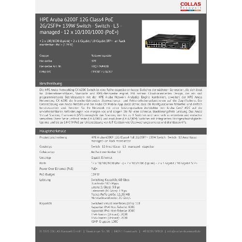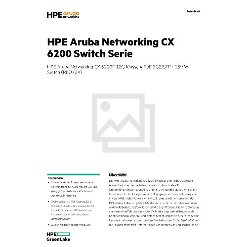 - Die HPE Aruba Networking CX 6200 Switch ist eine Reihe stapelbarer Access-Switches der nächsten Generation, die sich ideal für Unternehmensfilialen, Standorte und KMU-Netzwerke eignet. Mit seinem Cloud-orientierten Design, das ein voll programmierbares Betriebssystem mit der HPE Aruba Network Analytics Engine kombiniert, erweitert der HPE Aruba Networking CX 6200 die branchenführenden Überwachungs- und Fehlerbehebungsfunktionen auf die Zugriffsebene. Die Unterstützung von Aruba NetEdit und der Aruba CX Mobile App stellt sicher, dass die Konfigurationen fehlerfrei und einfach bereitzustellen sind. Bereiten Sie Ihr Netzwerk mit einer leistungsstarken Architektur von Aruba Gen7 ASIC auf die unvorhersehbaren Anforderungen von morgen vor, und sorgen Sie für eine schnelle, blockierungsfreie Leistung. Das Aruba Virtual Stacking Framework (VSF) ermöglicht das Stacking von bis zu 8 Switches und lässt sich so erweitern und einfacher verwalten. Diese Serie umfasst feste (CX 6200F) und modulare (CX 6200M) Switches mit integrierten Hochgeschwindigkeits-Uplinks und bis zu 1440 W PoE zur Unterstützung von IoT Geräten wie Überwachungskameras und drahtlosen APs.