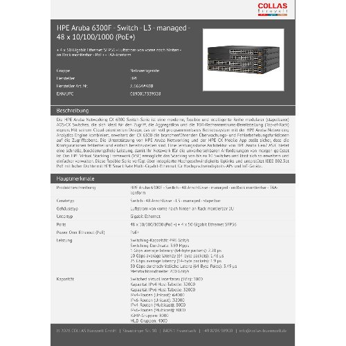Jetzt anmeldenProduktinformationen "HPE Aruba 6300F - Switch - L3 - managed - 48 x 10/100/1000 (PoE+)"