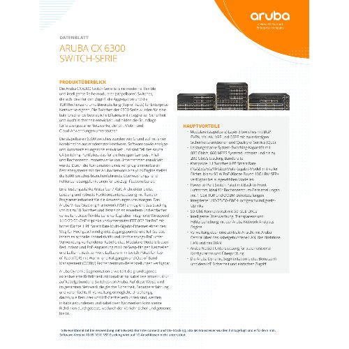 - Die HPE Aruba Networking CX 6300 Switch-Serie ist eine moderne, flexible und intelligente Reihe modularer (stapelbarer) AOS-CX Switches, die sich ideal für den Zugriff, die Aggregation und die TOR-Rechenzentrums-Bereitstellung (Top-of-Rack) eignen. Mit seinem Cloud-orientierten Design, das ein voll programmierbares Betriebssystem mit der HPE Aruba Networking Analytics Engine kombiniert, erweitert der CX 6300 die branchenführenden Überwachungs- und Fehlerbehebungsfunktionen auf die Zugriffsebene. Die Unterstützung von HPE Aruba Networking und der HPE CX Mobile App stellt sicher, dass die Konfigurationen fehlerfrei und einfach bereitzustellen sind. Eine leistungsstarke Architektur von HPE Aruba Gen7 ASIC bietet eine schnelle, blockierungsfreie Leistung, damit Ihr Netzwerk für die unvorhersehbaren Anforderungen von morgen gerüstet ist. Das HPE Virtual Stacking Framework (VSF) ermöglicht das Stacking von bis zu 10 Switches und lässt sich so erweitern und einfacher verwalten. Diese flexible Serie verfügt über integrierte Hochgeschwindigkeits-Uplinks und unterstützt IEEE 802.3bt PoE mit hoher Dichte mit HPE Smart Rate Multi-Gigabit-Ethernet für Hochgeschwindigkeits-APs und IoT-Geräte.