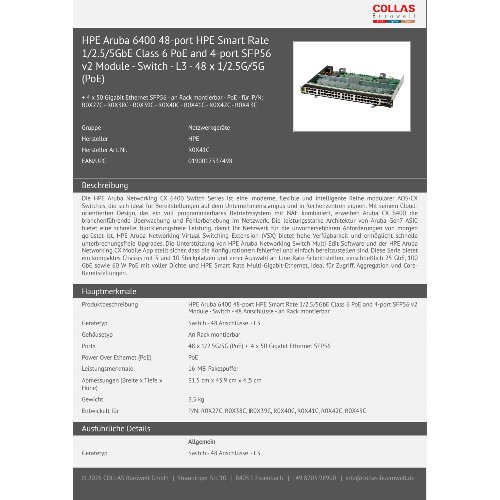 Jetzt anmeldenProduktinformationen "HPE Aruba 6400 48-port HPE Smart Rate 1/2.5/5GbE Class 6 PoE and 4-port SFP56 v2 Module - Switch - L3 - 48 x 1/2.5G/5G (PoE)"