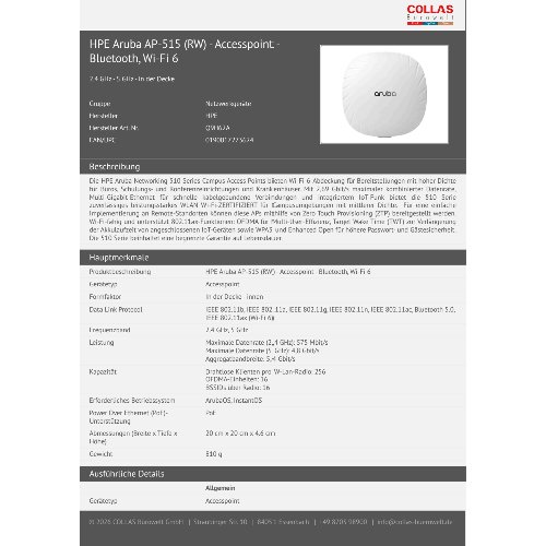 Jetzt anmeldenProduktinformationen "HPE Aruba AP-515 (RW) - Accesspoint - Bluetooth, Wi-Fi 6"