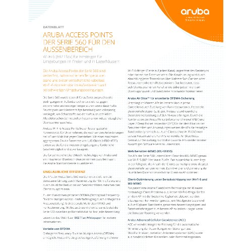 - Die Aruba Access Points (AP) der 560-Serie für den Außenbereich sind wetterfest, halten extremen Temperaturen stand und bieten wirtschaftliche kabellose Wi-Fi-6-Konnektivität im Außenbereich und bei schwierigen Umgebungsbedingungen. Sie wurde speziell für äußerst anspruchsvolle Bedingungen im Außenbereich entwickelt, sind gegen extrem hohe und niedrige Temperaturen sowie dauerhafte Feuchtigkeit und Niederschläge beständig und vollständig versiegelt, um Schadstoffe aus der Luft auszuschließen. Alle elektrischen Schnittstellen haben einen industrietauglichen Überspannungsschutz. Sie sind so konzipiert, dass sie die Benutzererfahrung durch Maximierung der Wi-Fi-Effizienz verbessern und die Übertragungszeit zwischen den Clients deutlich reduzieren. Zu den Funktionen gehören bis zu 2 Statial Streams, eine maximale Gesamtdatenrate von 1,49 Gbit/s (HE80/HE20), Uplink- und Downlink-OFDMA (Orthogonal Frequency Division Multiple Access), Downlink-Multi-User-MIMO (MU MIMO), zellulare Co-Location-Filterung, intelligente Leistungsüberwachung und ein integrierter Bluetooth 5- und 802.15.4-Funk.