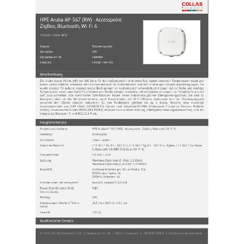 Jetzt anmeldenProduktinformationen "HPE Aruba AP-567 (RW) - Accesspoint - ZigBee, Bluetooth, Wi-Fi 6"